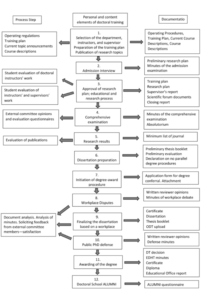 Quality assurance covers two main areas: the continuous evaluation of the doctoral training process and the monitoring of the quality requirements of degree conferral procedures. Doctoral schools are linked to the institutional quality assurance system through the EDHT, ensuring a continuous flow of information and uniform operation.